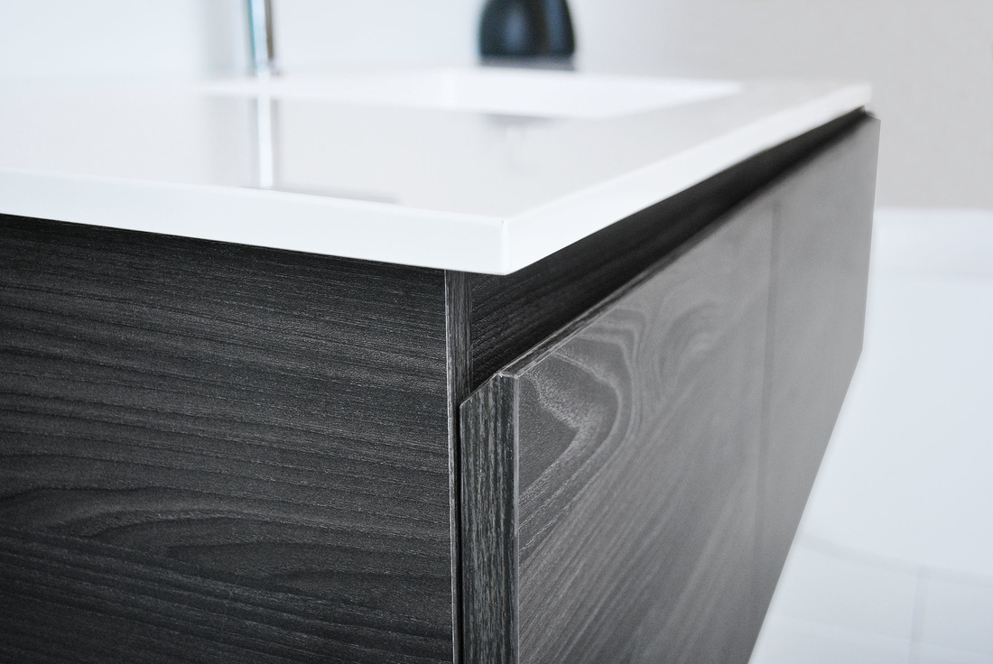 Cast Marble (Poly Marble) vanity tops are moulded using a heavy polymer resin mixed with a crushed marble. They are then coated with a durable gloss or matte gel coat.