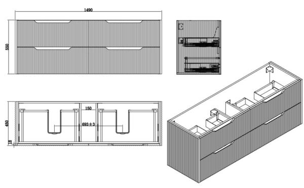 Bali Brown oak fluted wall hung vanity 1500 Cabinet Only